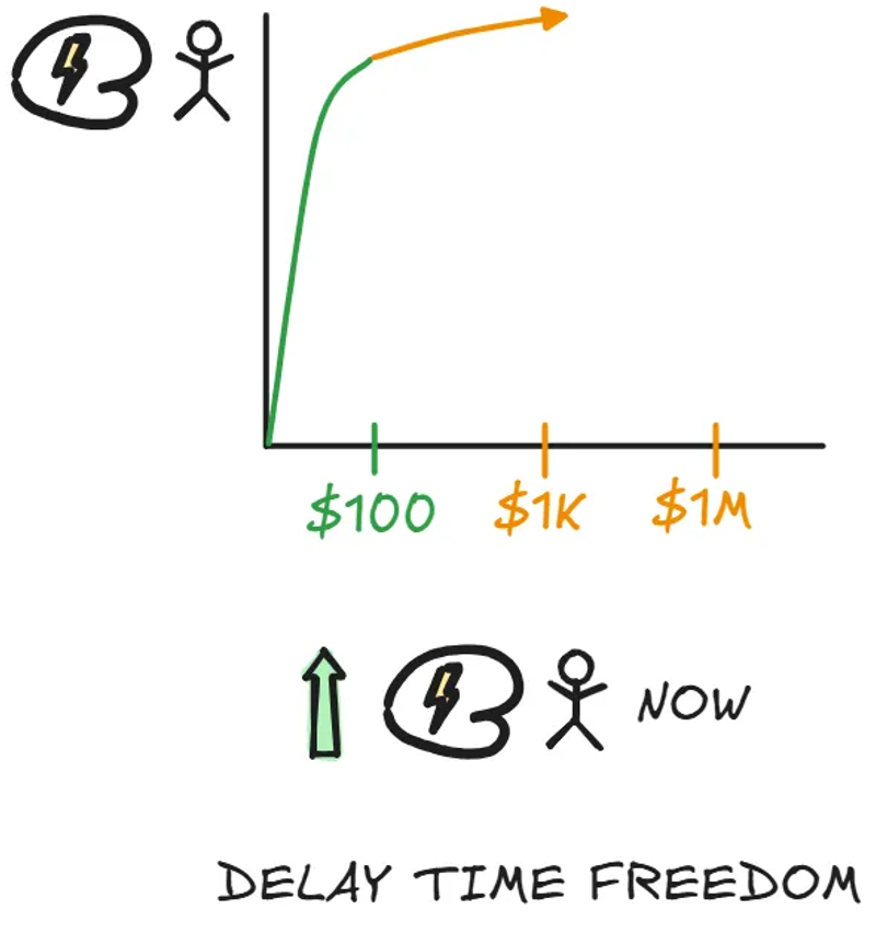 Every dollar you spend on consumption now is a dollar that won’t compound into future consumption potential. Every dollar you invest now delays gratification but grows into future consumption potential. And that future consumption potential is what determines whether you become time-free.