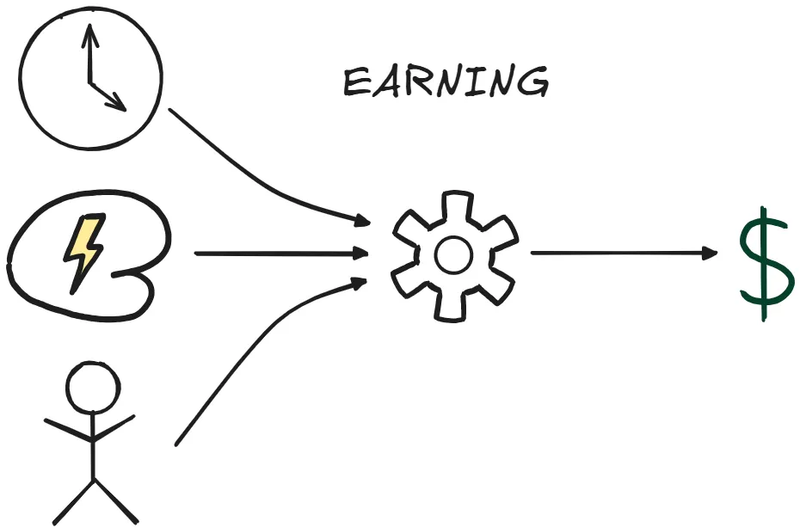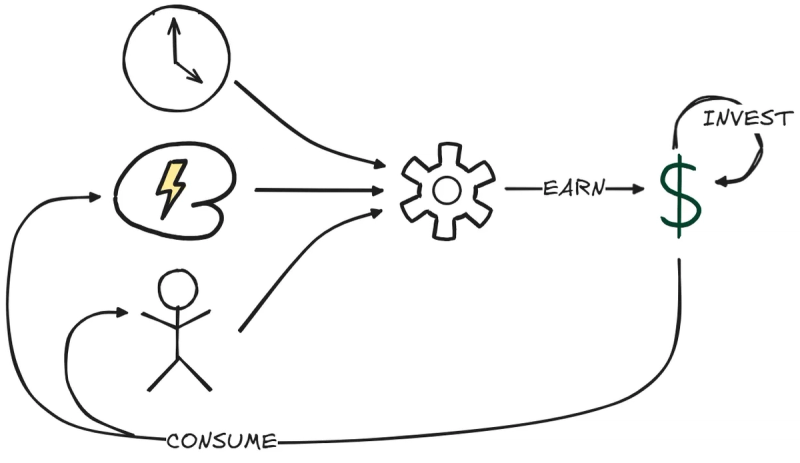 Every time you earn money, you’re converting your finite time, mental resource and physical resource into currency. That part’s obvious.