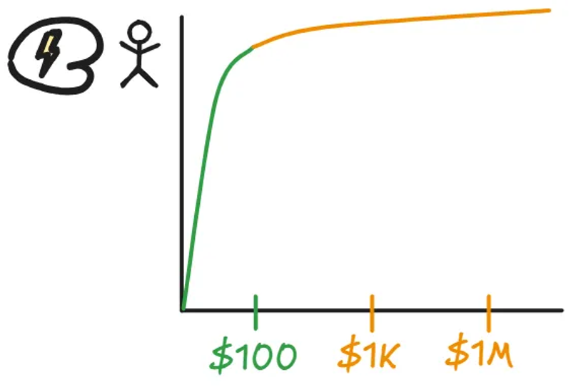 Consumption beyond these basic needs takes us towards diminishing marginal lifetime value (the line in orange). These are consumption for mental resource gain beyond mere survival e.g., a dinner out, a holiday overseas, a super yacht.